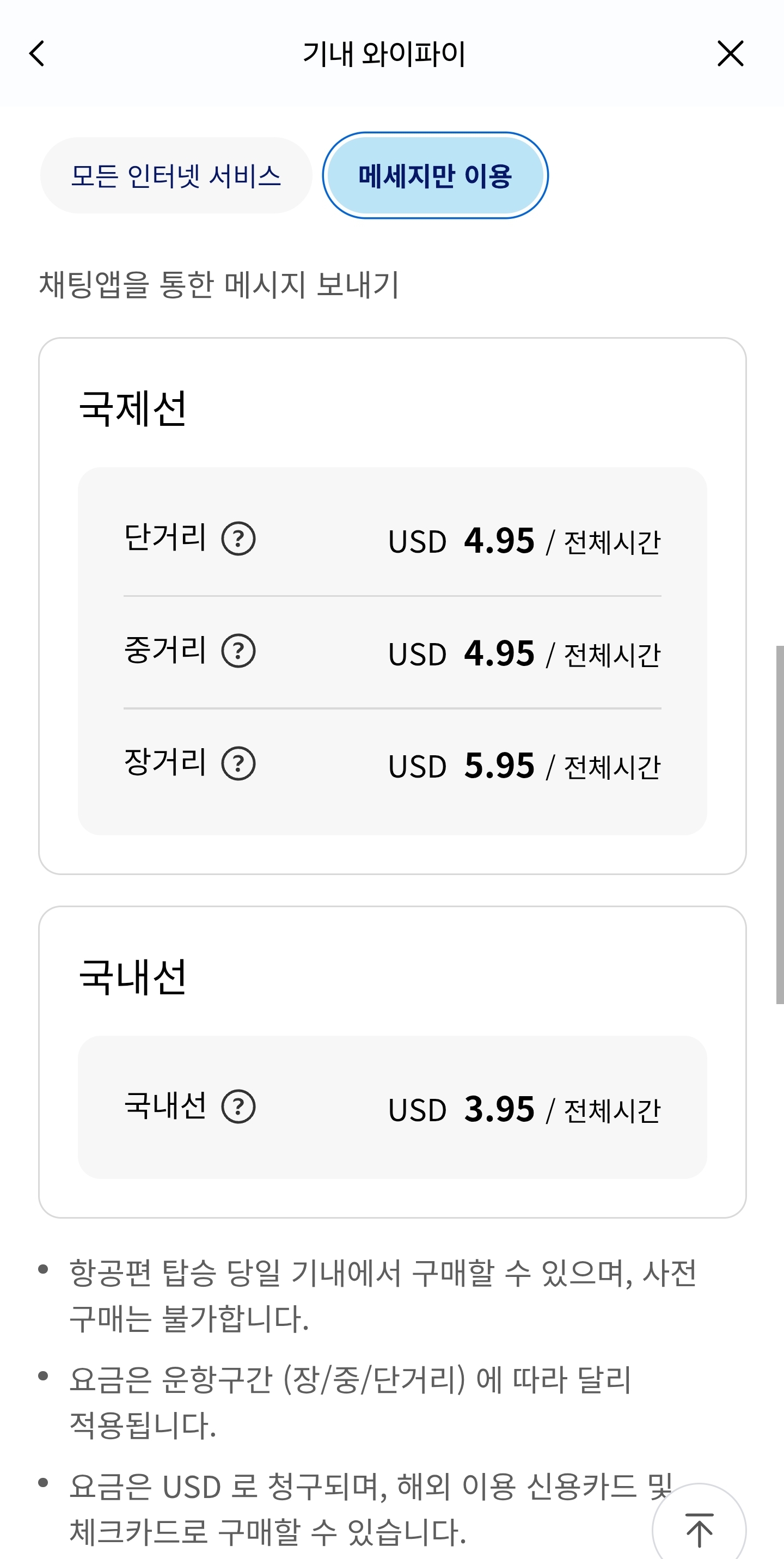 다들 예상하다시피 하늘위 서비스는 곧 돈이므로, 와이파이가 되는 기종의 비행기를 탔다면 국내항공사든 외항사든 돈내고 사용하면 된다